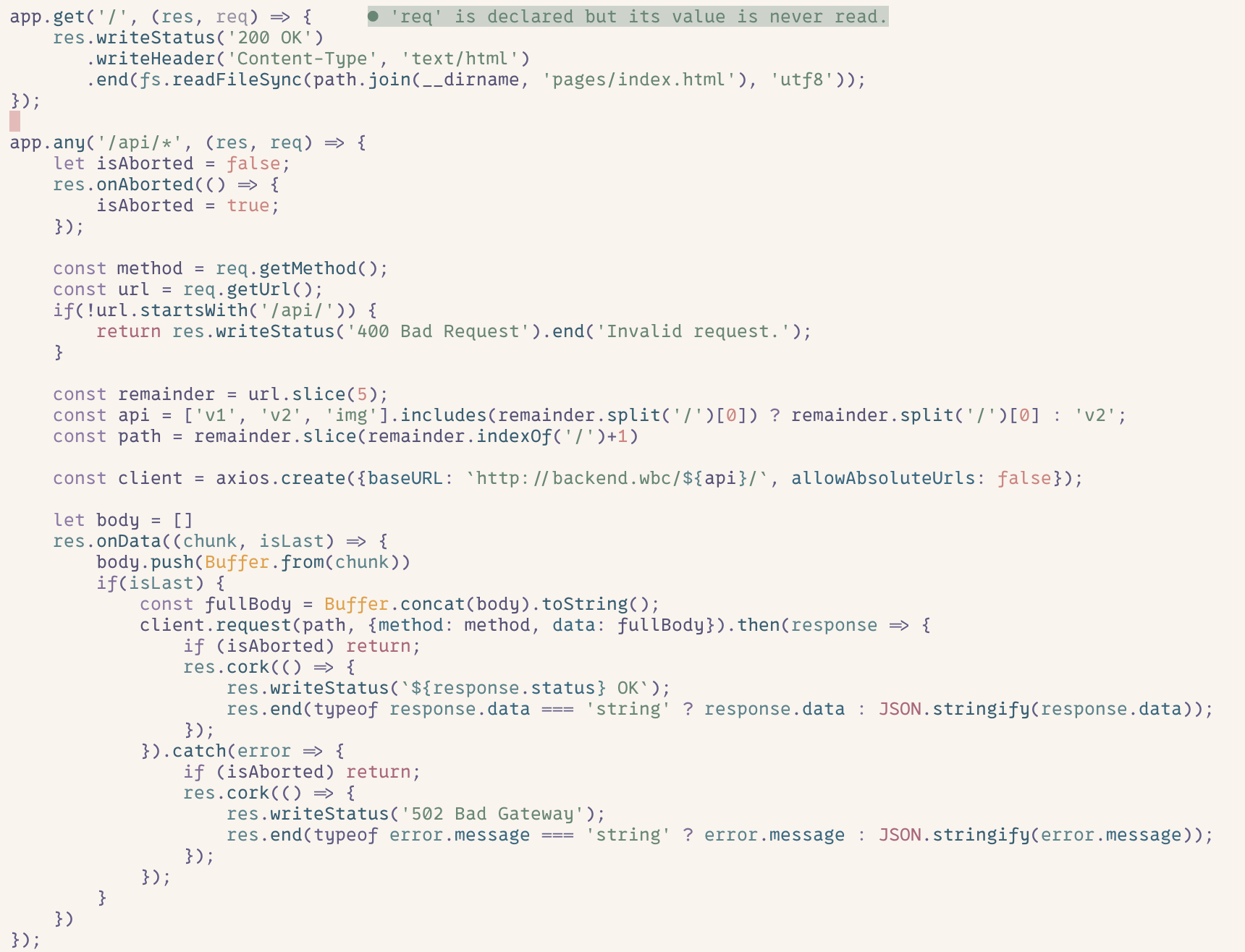 One piece of information was the locked version in the package.json for axios. Looking up the CVE we see there is a Server-side request forgery for axios and the version used has not been patched. The code also used the base URL which matches perfectly with the exploit. That means we could use something like http://localhost/api/img/http://v1.backend.wbc/candidates and be able to access any internal hostnames that we want.