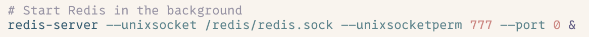 Redis is pretty simple. There is a start script which starts redis using a socket and disabling the port by provide the port 0 to bind to. The thing to note here is that the permissions given to this socket is 777. So anyone or anything can access this socket. Another important thing to note is that the default redis container does NOT provide any authentication by design to help with testing. So any commands sent to the redis container would not require authentication.