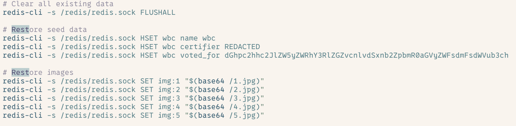There is also another script that runs as a cron job. It resets the redis container populating it with default data. Including the information regarding wbc vote.