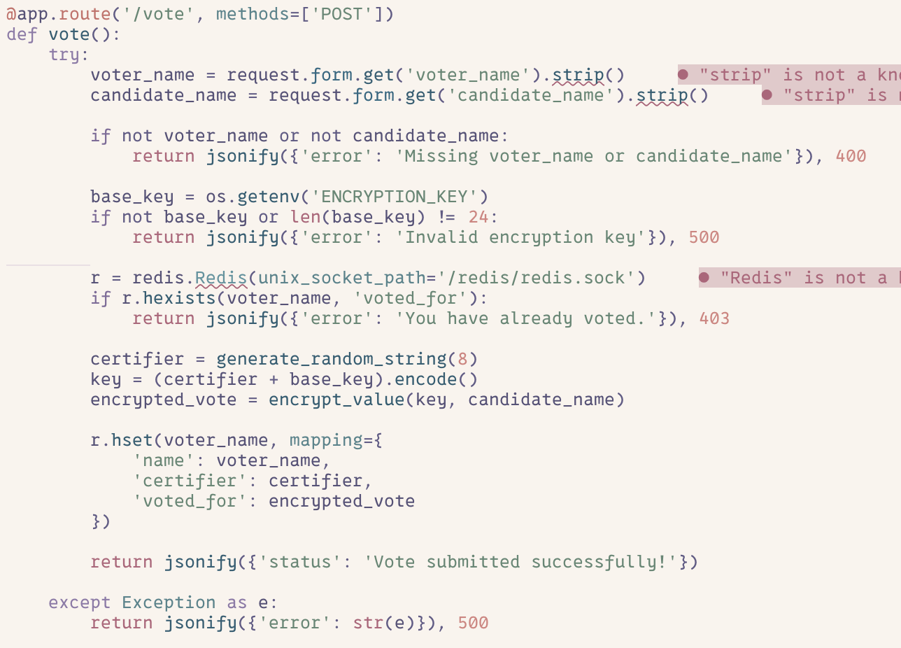 The encrypt_value route tells us the encryption method, the values we need to find and how to decrypt it. We require the certifier, the encrypted vote and the encryption key to be able to decrypt this value.